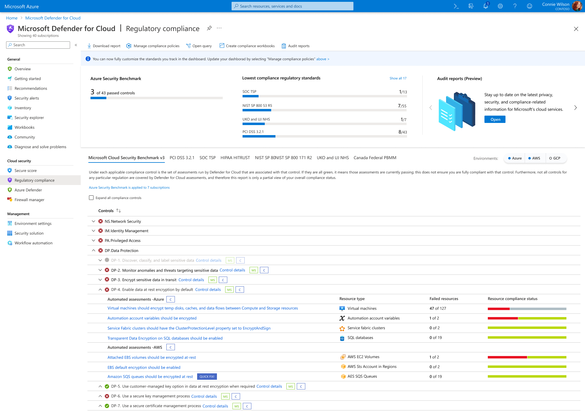 The compliance dashboard provides a dedicated benchmark view to help you monitor resource compliance against benchmark controls. Non-Azure platforms follow the same cloud-neutral security principles as Azure. Each control provides a consistent level of technical implementation guidance across Azure and other cloud resources.