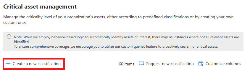 To create custom critical asset rules to tag your resources as Critical resources in Defender for Cloud, select the Create a new classification button.