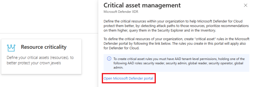 The Critical asset management pane opens. Select Open Microsoft Defender portal."
