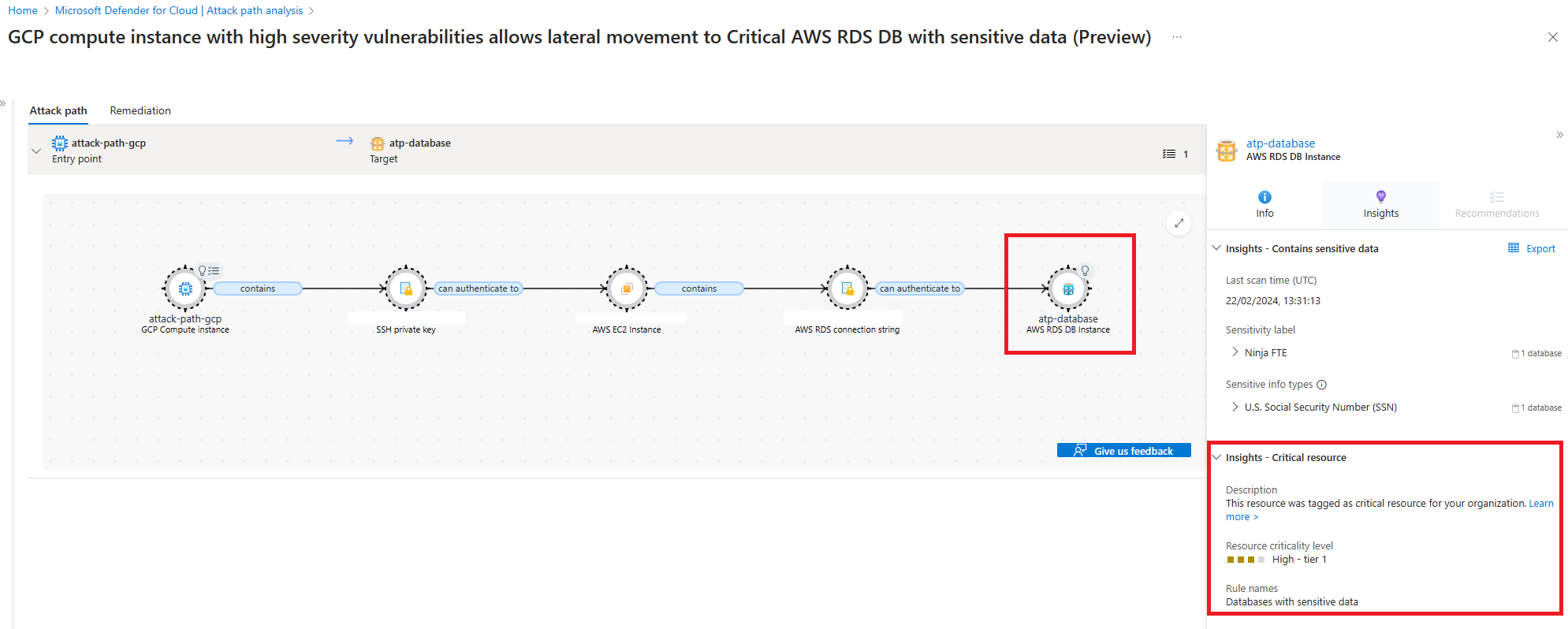 If you select an attack path title, you can see its details. Select the target, and under Insights - Critical resource, you can see the critical asset tagging information.