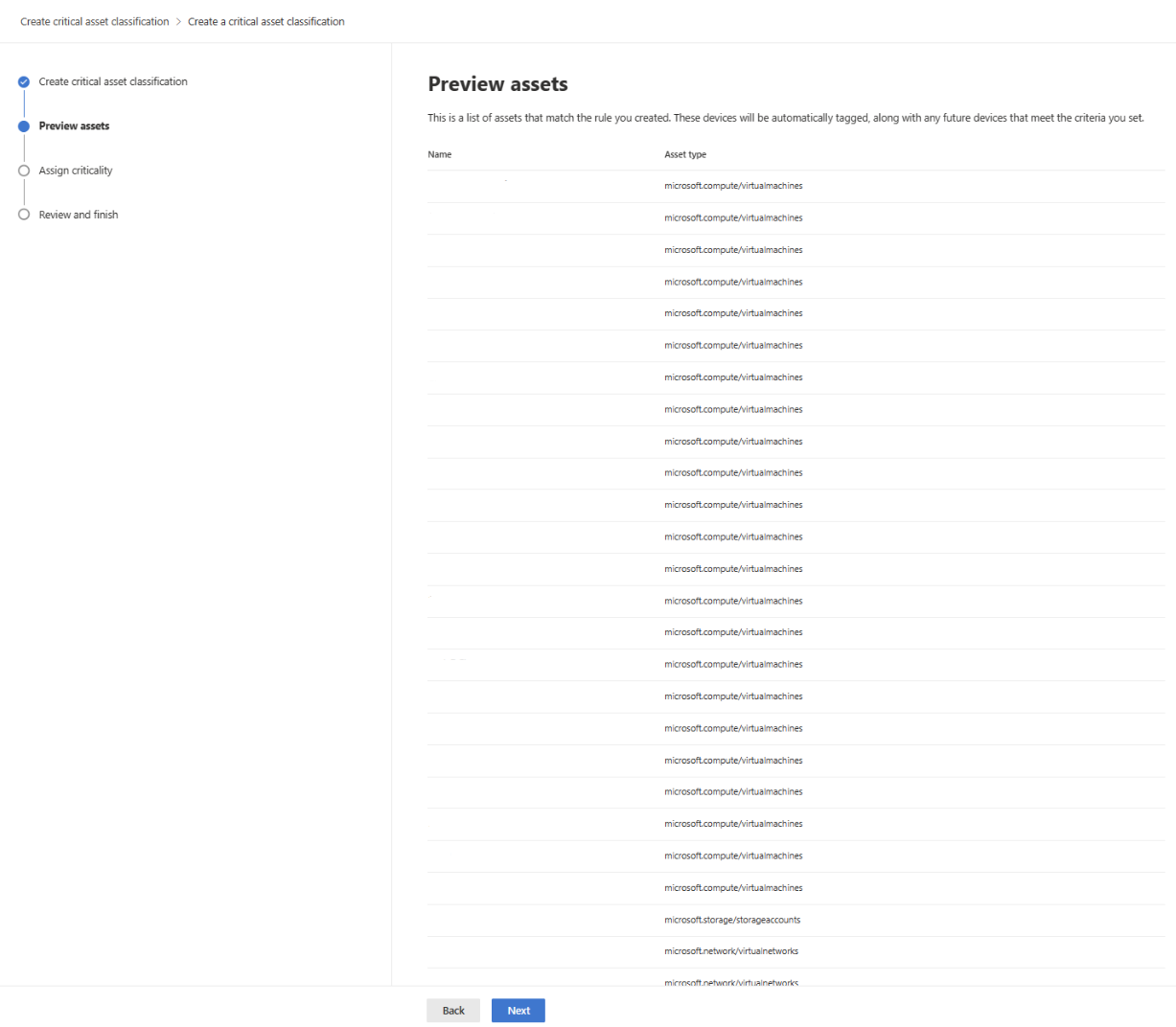 On the Preview assets page, you can see a list of assets that match the rule you created. After reviewing the page, select Next.