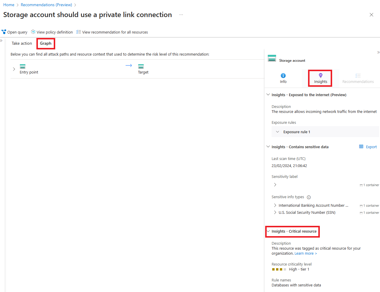 Select a recommendation, and then choose the Graph tab. Then choose the target, and select the Insights tab. You can see the critical asset tagging information.