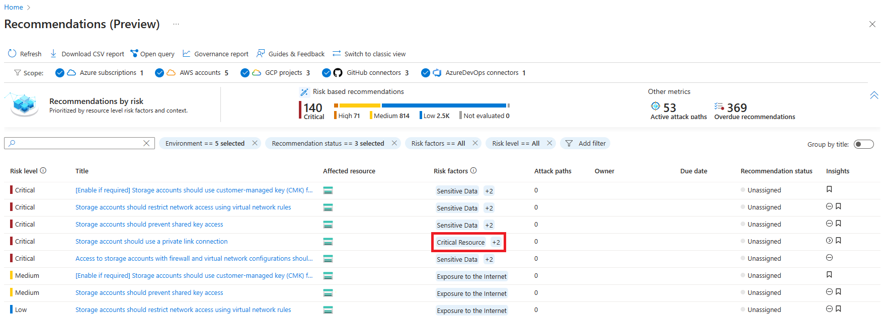 In the Recommendations page of Defender for Cloud, select the Preview available banner to see all the recommendations, which are now prioritized based on asset criticality.
