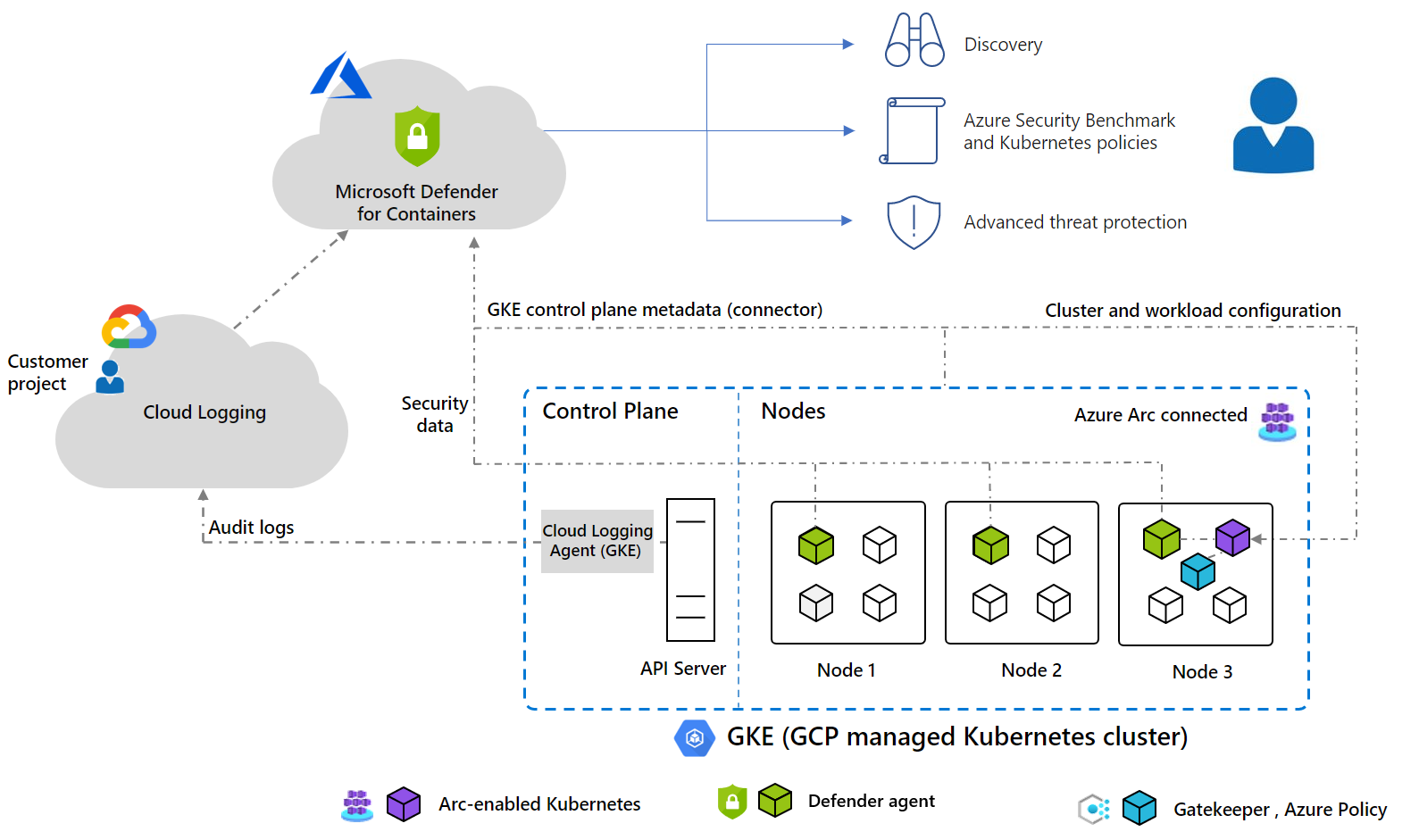 Agentless discovery: Provides visibility into your Kubernetes clusters without requiring any agents, by using Azure native capabilities to discover and assess cluster configurations.