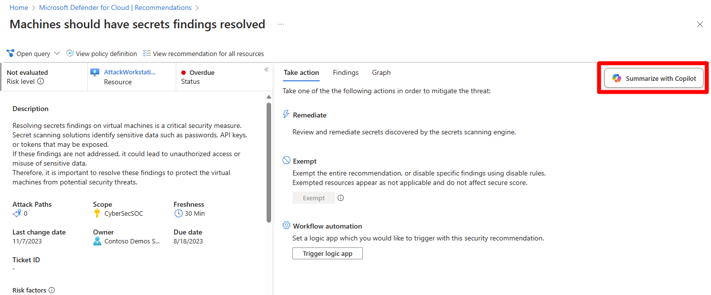 Microsoft Defender for Cloud's integration with Microsoft Security Copilot lets you summarize a recommendation so you can better understand the risks and vulnerabilities in your environment.