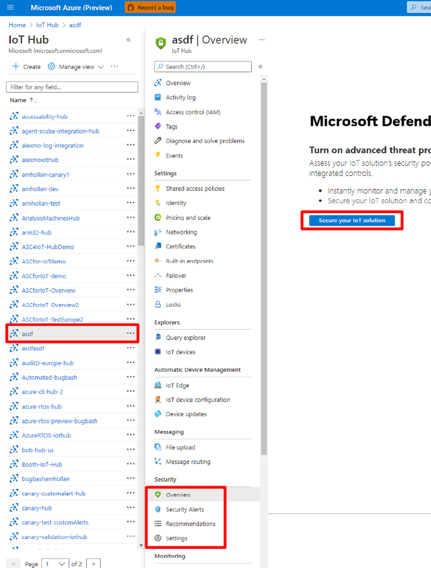 You can create a hub in the Azure portal. For all new IoT hubs, Defender for IoT is set to On by default.