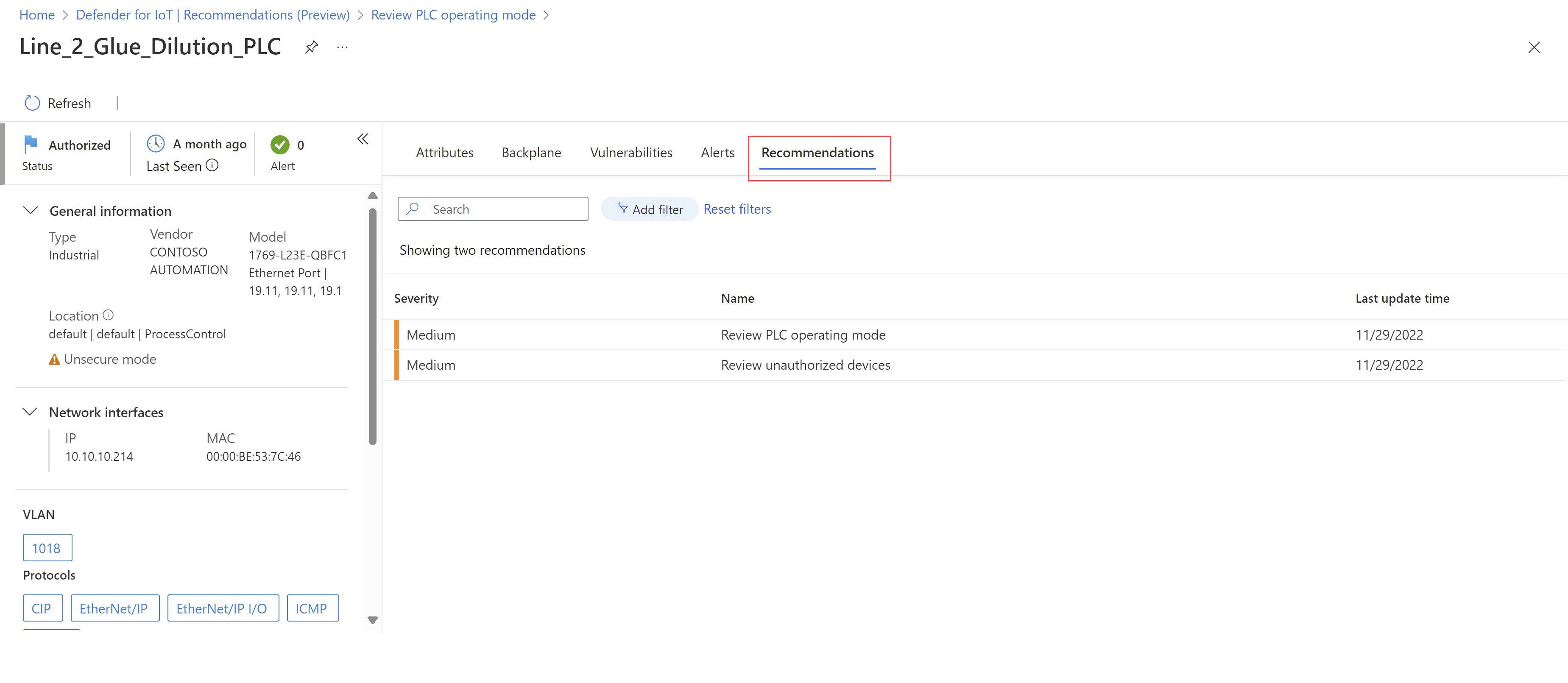 | Review PLC operating mode | Devices with this recommendation are found with PLCs set to unsecure operating mode states. We recommend setting PLC operating modes to the Secure Run state if access is no longer required to the PLC to reduce the threat of malicious PLC programming. |