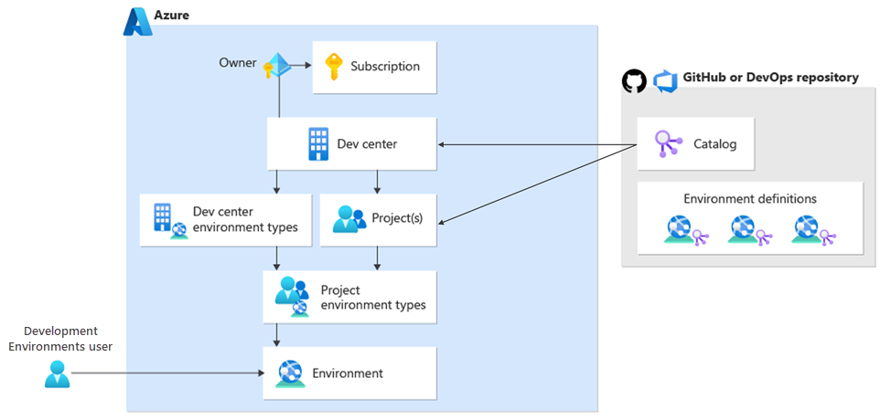 Deployment Environments and Dev Box are complementary services that share certain architectural components. Dev centers and projects are common to both services, and they help organize resources in an enterprise. You can configure projects for Deployment Environments and projects for Dev Box resources in the same dev center.