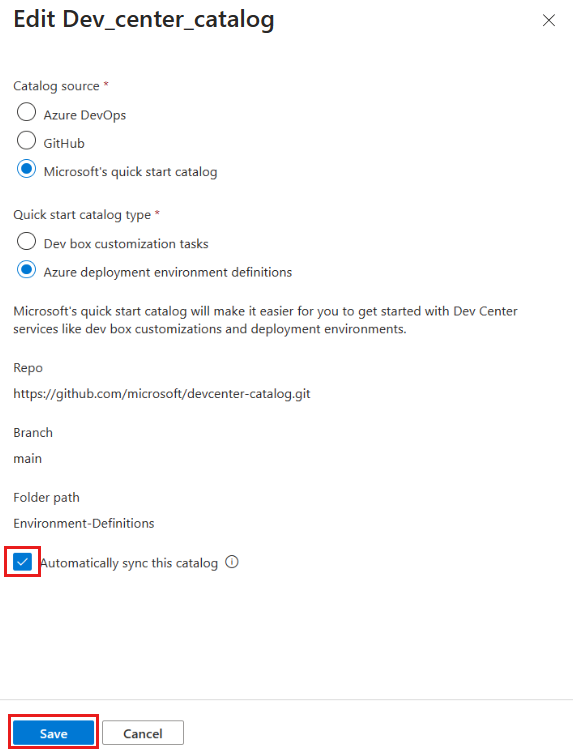 In the Edit catalog pane, select Automatically sync this catalog, and then select Save.