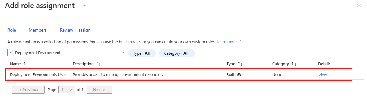 Assign DevCenter Deployment Environments Reader role to developers who need to view environments of a specific environment type.