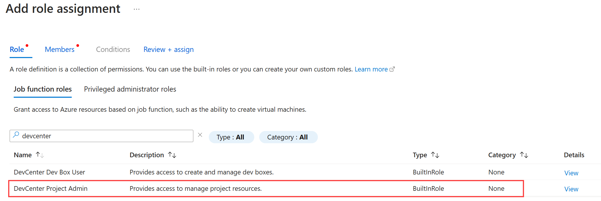 Setting Value Role Select DevCenter Project Admin. Assign access to Select User, group, or service principal. Members Select the users or groups to grant administrative access. Select Save.