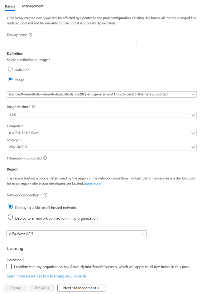 2. Select your desired deployment region for the dev boxes. Choose a region close to your expected dev box users for the optimal user experience.Licensing Select this checkbox to confirm that your organization has Azure Hybrid Benefit licenses that you want to apply to the dev boxes in this pool. On the Management tab, enter the following values: