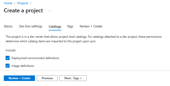 Setting Value Deployment environment definitions Select to enable Dev Box to sync deployment environments definitions from a catalog attached to the project. Image definitions Select to enable Dev Box to sync image definitions from a catalog attached to the project. (Optional) On the Tags tab, enter a name/value pair to assign.