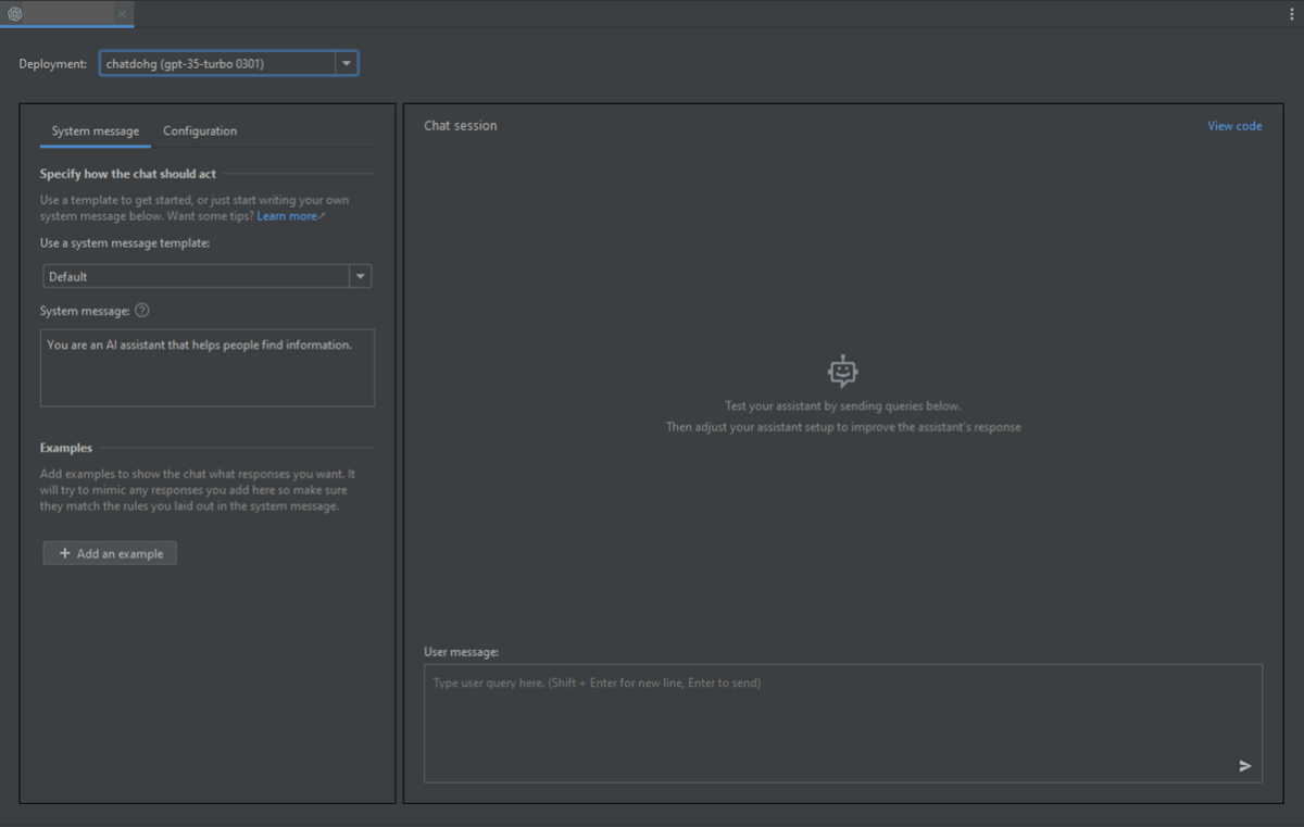 2. You can start exploring OpenAI capabilities through the Azure OpenAI Studio Chat playground in IntelliJ IDEA.