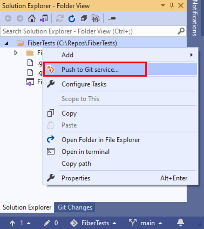 In Solution Explorer, right-click the solution name, or right-click any item in the Folder view of Solution Explorer and then select Push to Git service to launch the Create a Git repository window.