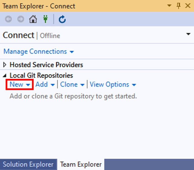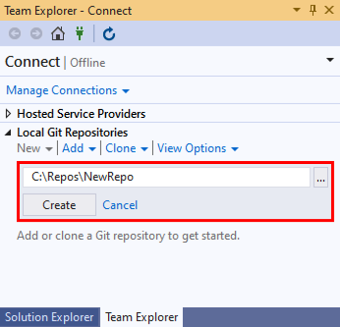 In Solution Explorer, right-click the solution name, or right-click any item in the Folder view of Solution Explorer, and then select Create Git Repository. Or, choose Add to Source Control on the status bar in the lower right-hand corner of Visual Studio, and then select Git. If you don't see these options, then your code is already in a Git repo.