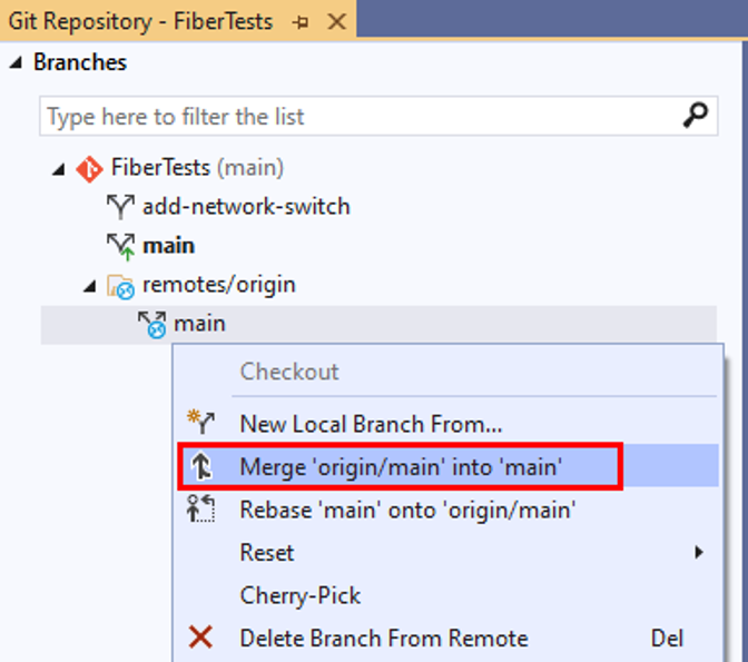 1. In the Branches pane of the Git Repository window, checkout the target branch. Then right-click the source branch and choose Merge <source-branch> into <target-branch>.
