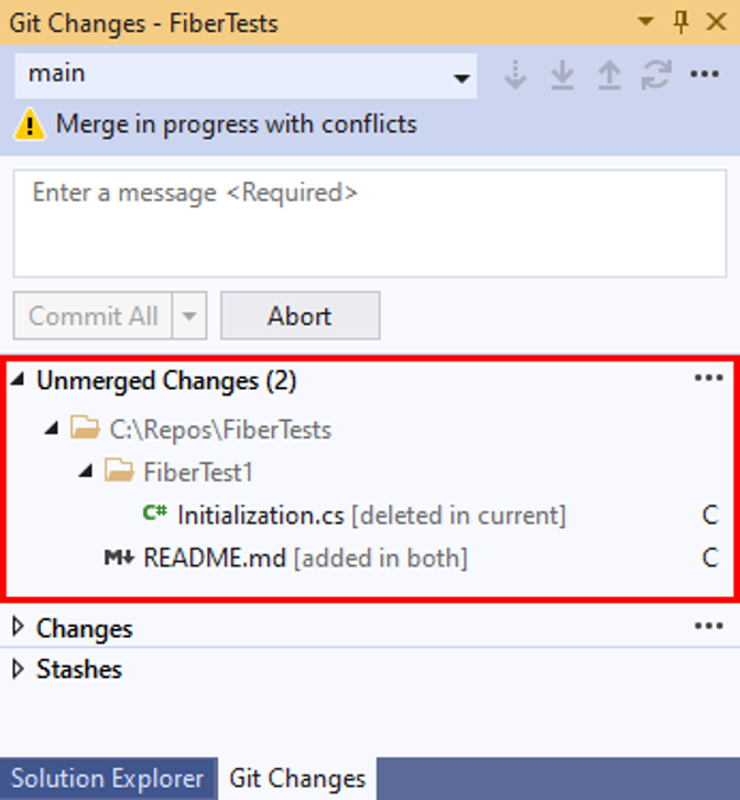 2. Visual Studio will notify you if Git halted the merge due to conflicts. In that event, you can either resolve the conflicts, or cancel the merge and return to the pre-merge state. The Unmerged Changes section of the Git Changes window lists the files with merge conflicts. For a file with merge conflicts in its content, double-click the file to open it in the merge editor.