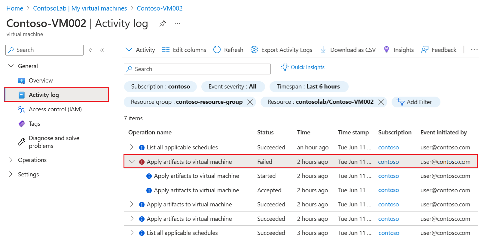 Go to the Activity log page for the lab VM and locate the artifact with the Failed status: