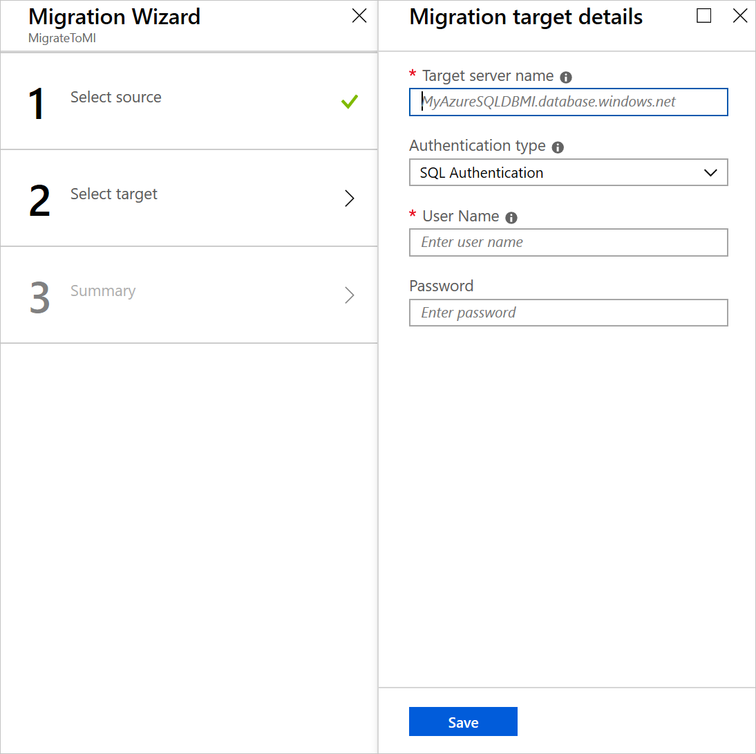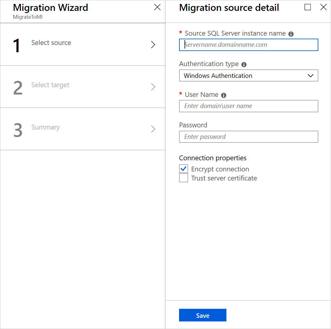 On the Migration source detail screen, specify the connection details for the source SQL Server.