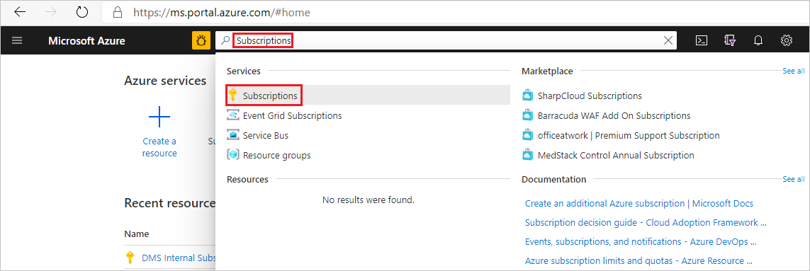Before creating your first DMS instance, sign in to the Azure portal, and then search for and select Subscriptions.