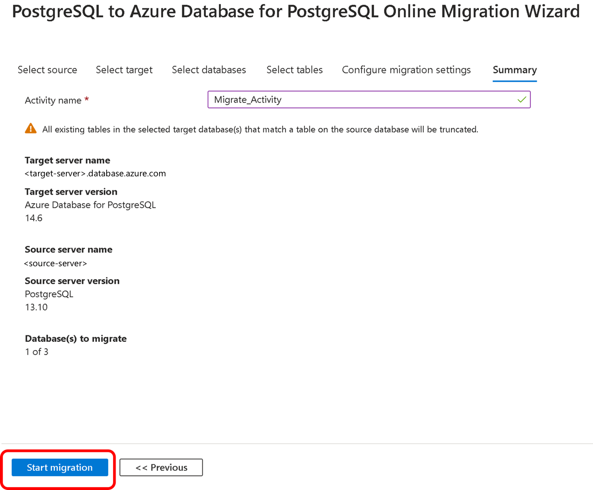 On the Migration summary screen, in the Activity name text box, specify a name for the migration activity, and then review the summary to ensure that the source and target details match what you previously specified.