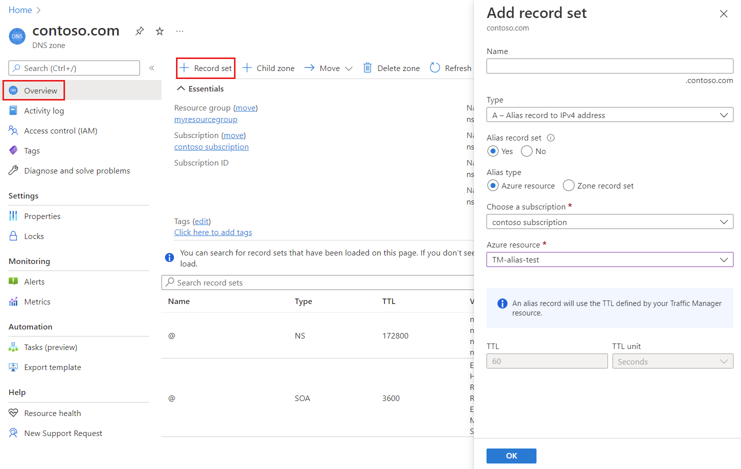 On the Overview page of contoso.com DNS zone, select the + Record set button.