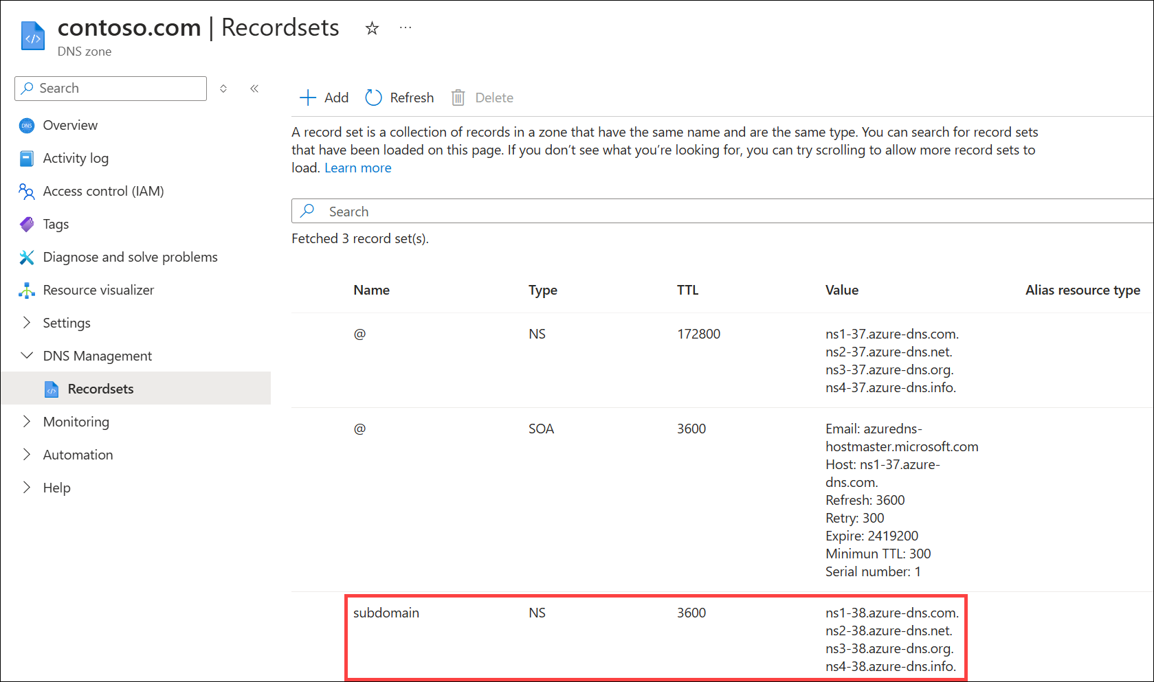 3. You'll find a record set of type NS and name subdomain created in the parent DNS zone. Compare the name servers in this record set with the ones you retrieved from the child DNS zone. The NS records should match.