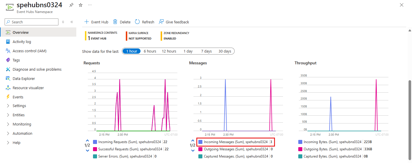 az logincommand.In the Azure portal, verify that the event hub received the messages. To update the chart, refresh the page. It might take a few seconds for it to show that the messages are received.
