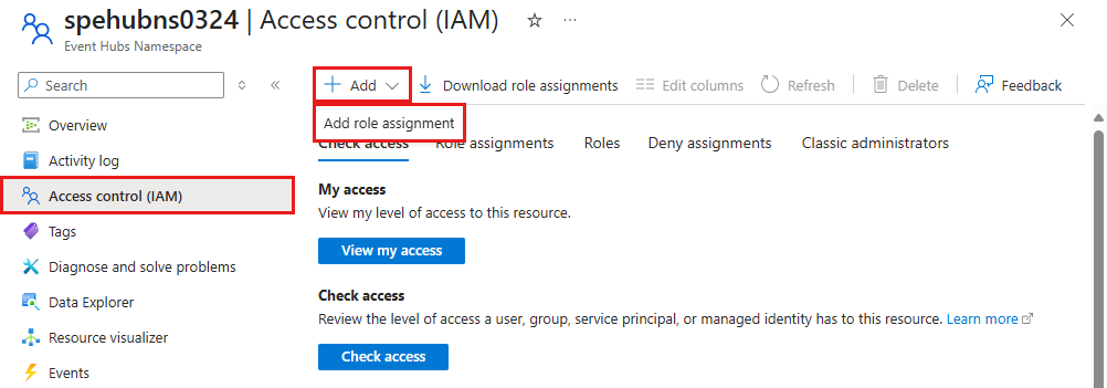 When you develop locally, make sure that the user account that connects to Azure Event Hubs has the correct permissions. You need the Azure Event Hubs Data Owner role to send and receive messages. To assign yourself this role, you need the User Access Administrator role, or another role that includes the Microsoft.Authorization/roleAssignments/write action. You can assign Azure RBAC roles to a user using the Azure portal, Azure CLI, or Azure PowerShell. For more information, see Understand scope for Azure RBAC page.
