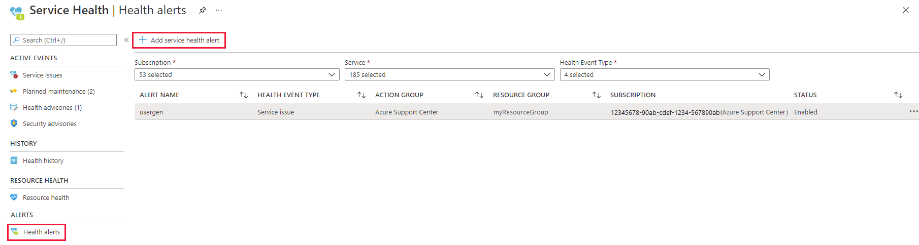 Azure Service Health supports customized alerting for maintenance events. To configure an alert for ExpressRoute Circuit maintenance, navigate to Health alerts under the Alerts section on the left side of the page. Here you see a table of previously configured alerts.