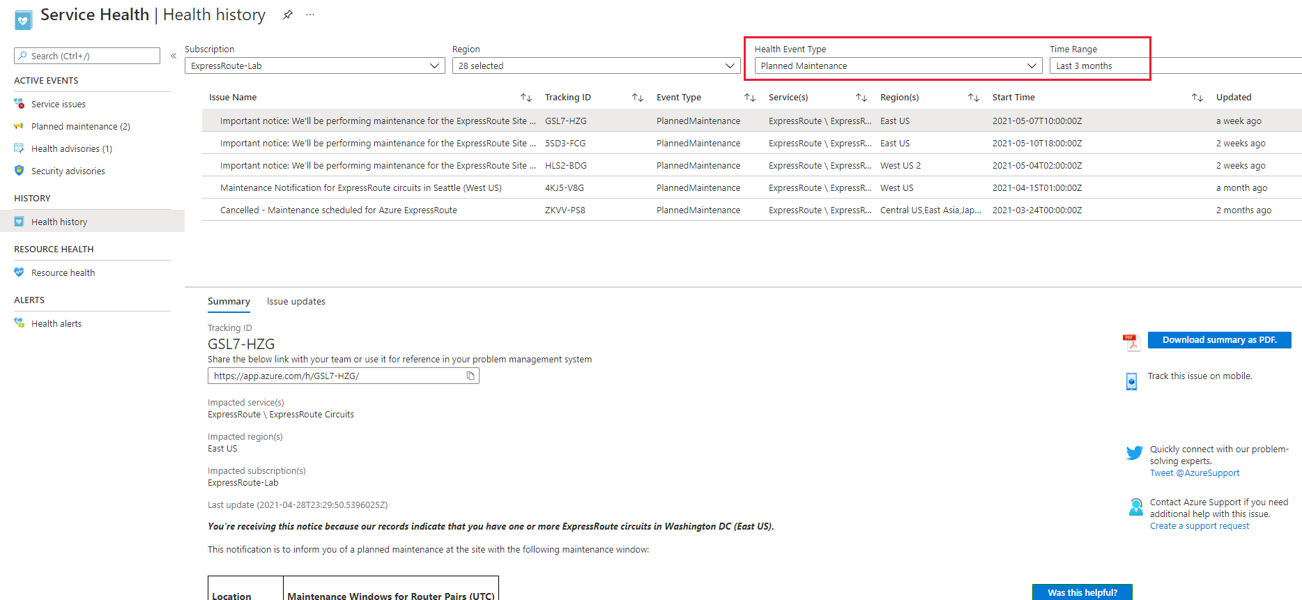 On this page, you can review individual maintenance events by filtering on a target subscription and Azure Region. To further narrow the scope of health history events, you can select the health event type and define a past time range. To filter for planned ExpressRoute circuit maintenance, set the Health Event Type to Planned Maintenance.