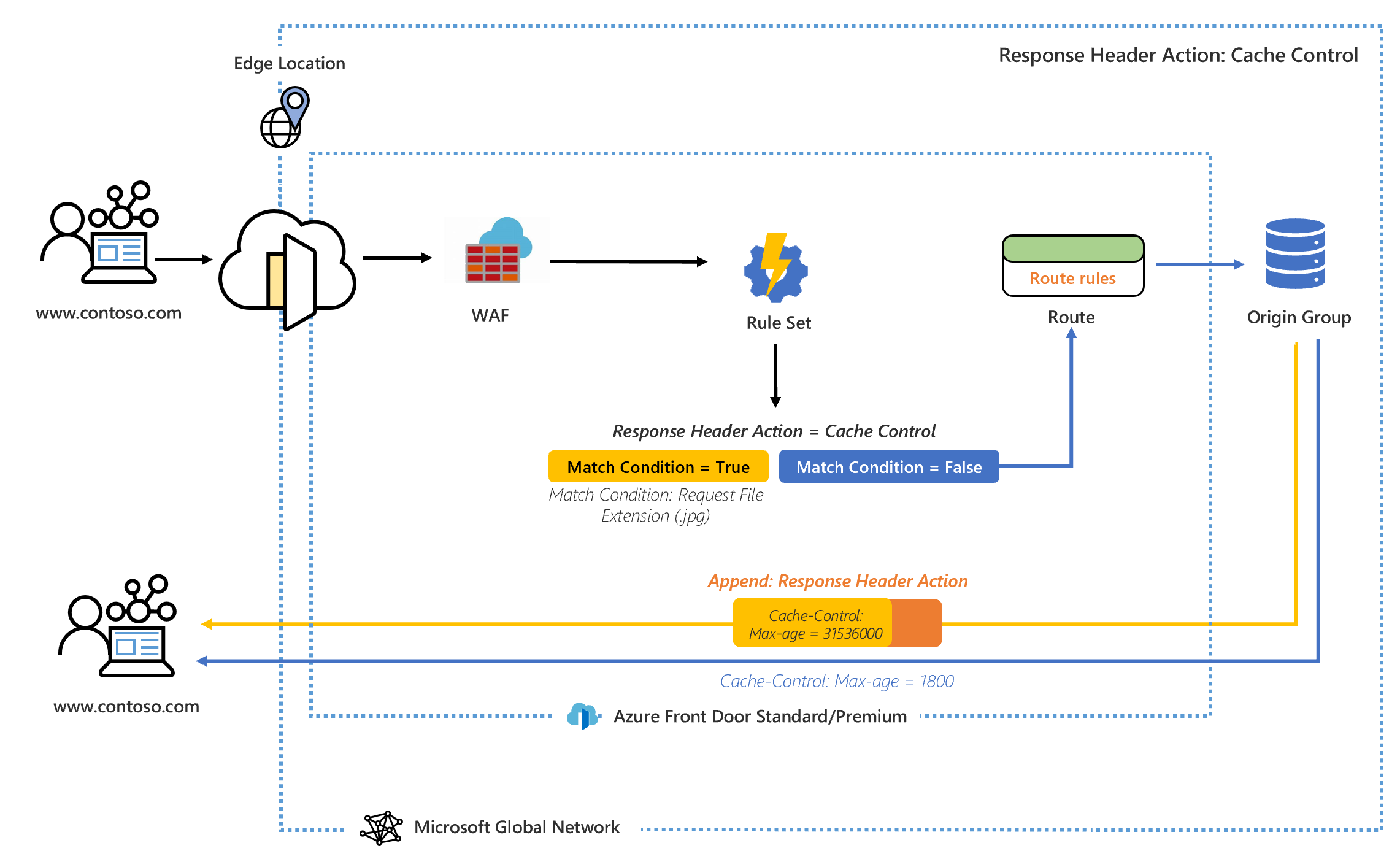 In the following diagram, WAF policies get processed first. Then the rule set configuration appends a response header. The header changes the max-age of the cache control if the match condition is true.