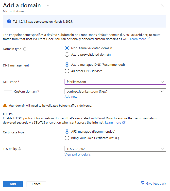 Under Settings, select Domains for your Azure Front Door profile. Then select + Add.