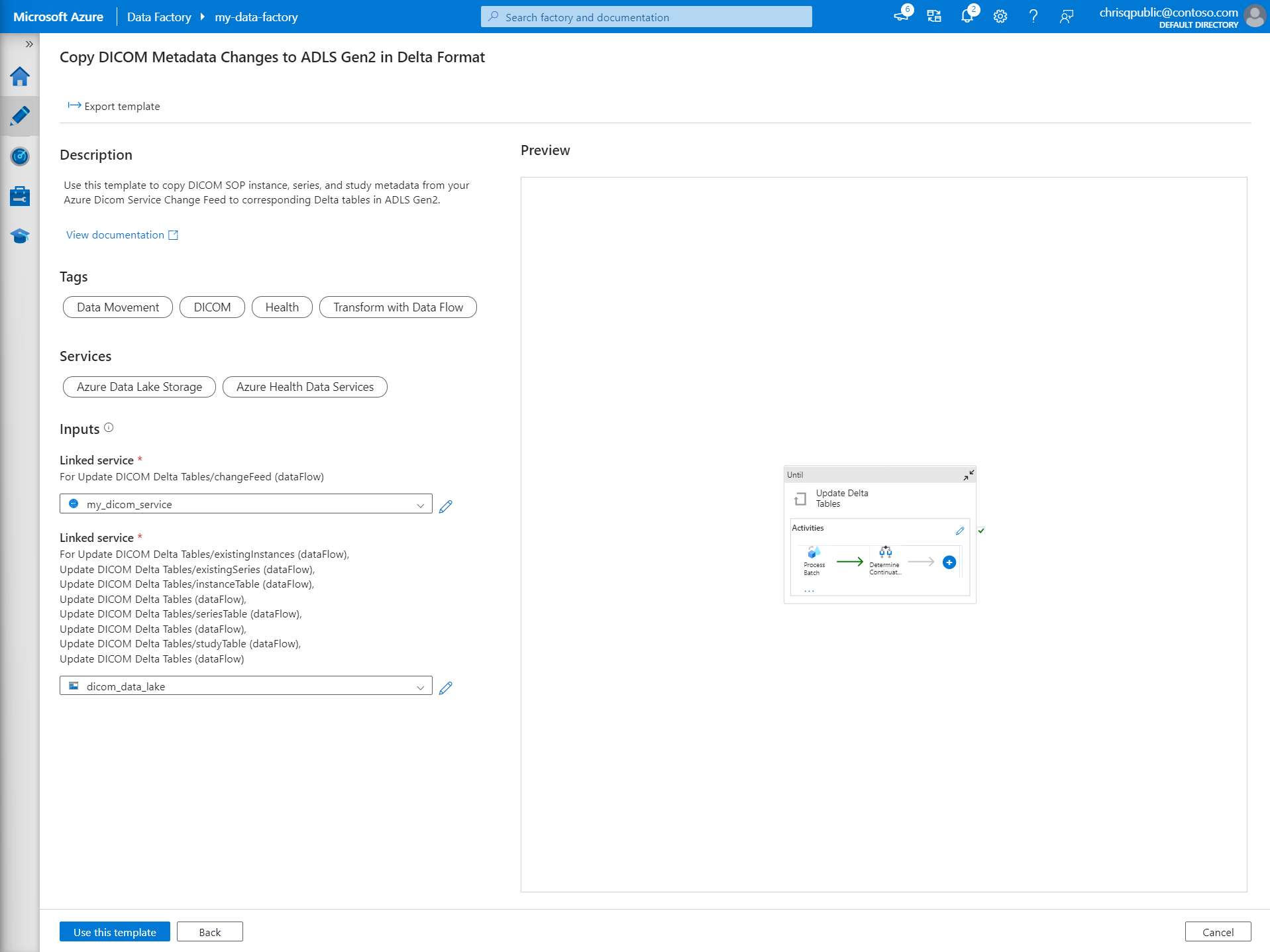 - Use Data Factory templates to create a pipeline from the DICOM service to a Data Lake Storage Gen2 account.