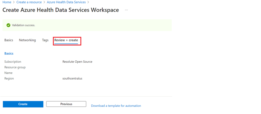 Create instances of the FHIR service, DICOM service, and MedTech service in the newly created Azure Health Data Services workspace.