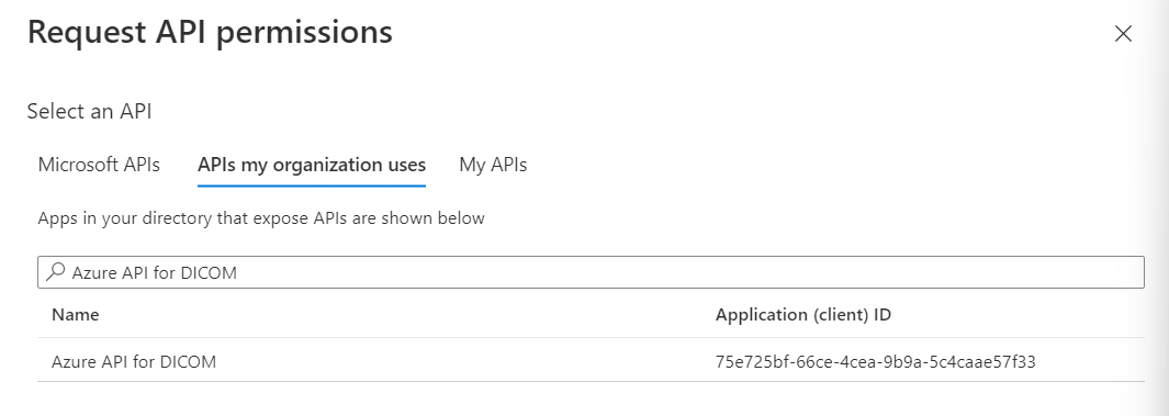 If you're using Azure Health Data Services, you'll add a permission to the DICOM service by searching for Azure API for DICOM under APIs my organization uses.