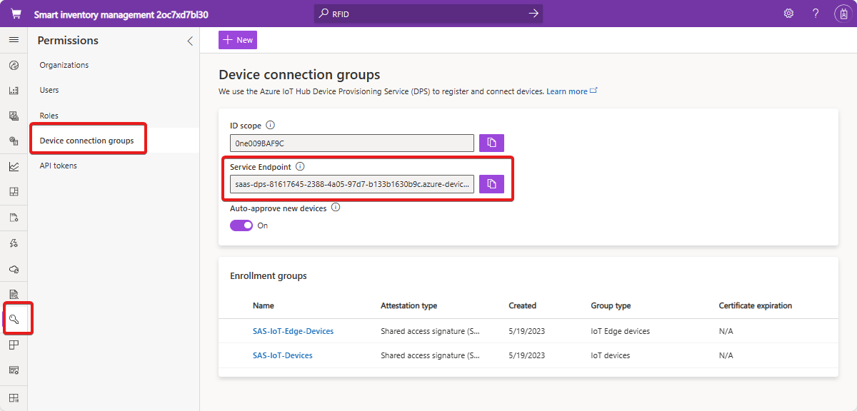 Screenshot from IoT Central application that shows the direct DPS endpoint.