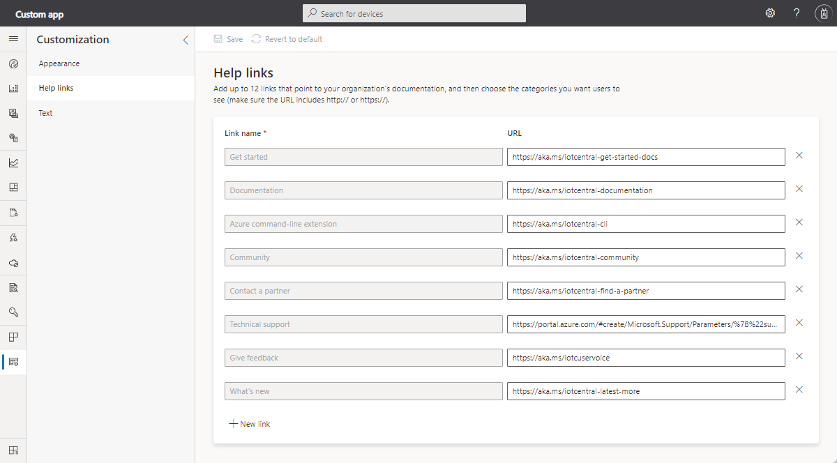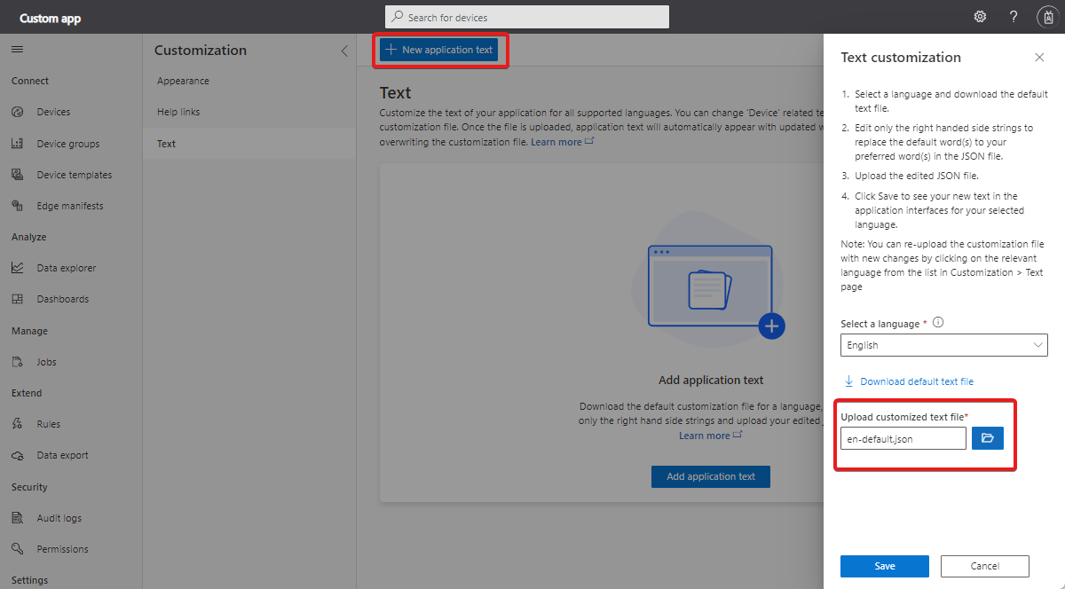 On this page, you can customize the text of your application for all supported languages. After you upload the custom text file, the application text automatically appears with the updated text. You can make further customizations by editing and overwriting the customization file. You can repeat the process for any language that the IoT Central UI supports.
