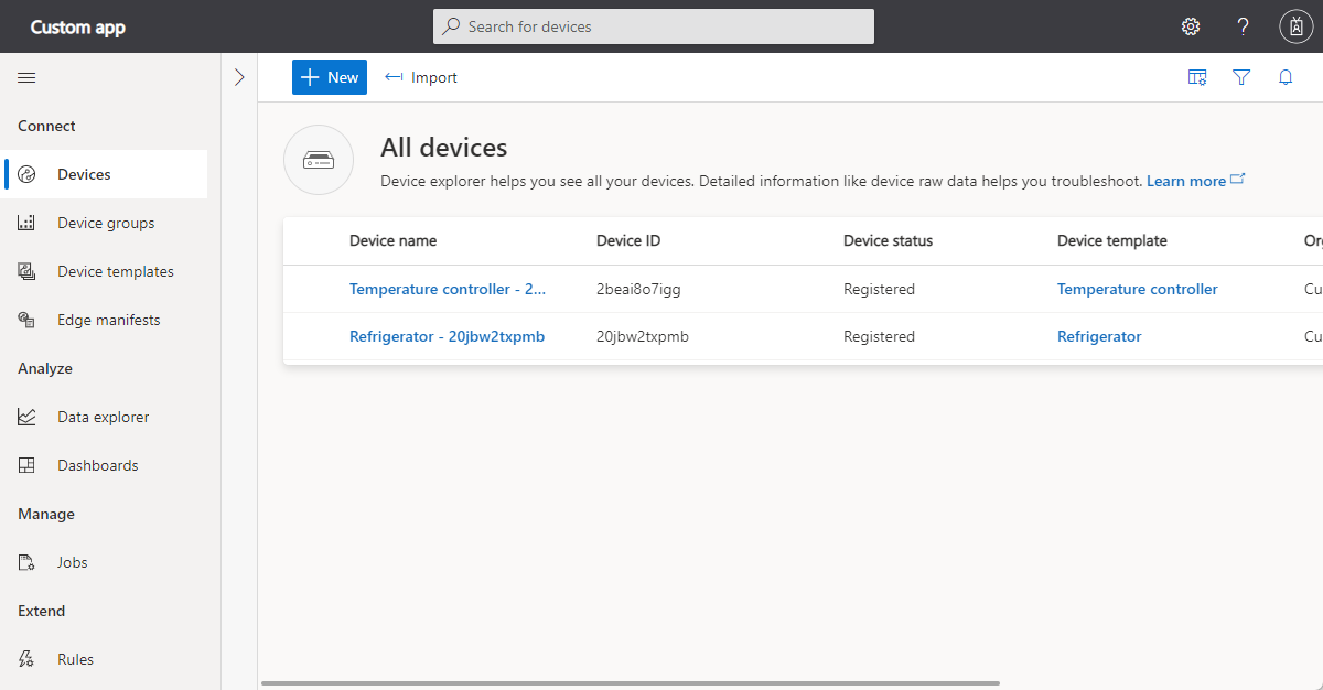devicewithasset, open the file in a text editor and edit the value strings as shown in the following example:{ "Device": { "AllEntities": "All assets", "Approve": { "Confirmation": "Are you sure you want to approve this asset?", "Confirmation_plural": "Are you sure you want to approve these assets?" }, "Block": { "Confirmation": "Are you sure you want to block this asset?", "Confirmation_plural": "Are you sure you want to block these assets?" }, "ConnectionStatus": { "Connected": "Connected", "ConnectedAt": "Connected {{lastReportedTime}}", "Disconnected": "Disconnected", "DisconnectedAt": "Disconnected {{lastReportedTime}}" }, "Create": { "Description": "Create a new asset with the given settings", "ID_HelpText": "Enter a unique identifier this asset will use to connect.", "Instructions": "To create a new asset, select an asset template, a name, and a unique ID. <1>Learn more <1></1></1>", "Name_HelpText": "Enter a user friendly name for this asset. If not specified, this will be the same as the asset ID.", "Simulated_Label": "Simulate this asset?", "Simulated_HelpText": "A simulated asset generates telemetry that enables you to test the behavior of your application before you connect a real asset.", "Title": "Create a new asset", "Unassigned_HelpText": "Choosing this will not assign the new asset to any asset template.", "HardwareId_Label": "Hardware type", "HardwareId_HelpText": "Optionally specify the manufacturer of the asset", "MiddlewareId_Label": "Connectivity solution", "MiddlewareId_HelpText": "Optionally choose what type of connectivity solution is installed on the asset" }, "Delete": { "Confirmation": "Are you sure you want to delete this asset?", "Confirmation_plural": "Are you sure you want to delete these assets?", "Title": "Delete asset permanently?", "Title_plural": "Delete assets permanently?" }, "Entity": "Asset", "Entity_plural": "Assets", "Import": { "Title": "Import assets from a file", "HelpText": "Choose the organization that can access the assets you’re importing, and then choose the file you’ll use to import. <1>Learn more <1></1></1>", "Action": "Import assets with an org assignment from a chosen file.", "Upload_Action": "Upload a .csv file", "Browse_HelpText": "You’ll use a CSV file to import assets. Click “Learn more” for samples and formatting guidelines." }, "JoinToGateway": "Attach to gateway", "List": { "Description": "Grid displaying list of assets", "Empty": { "Text": "Assets will send data to IoT Central for you to monitor, store, and analyze. <1>Learn more <1></1></1>", "Title": "Create an Asset" } }, "Migrate": { "Confirmation": "Migrating selected asset to another template. Select migration target.", "Confirmation_plural": "Migrating selected assets to another template. Select migration target." }, "Properties": { "Definition": "Asset template", "DefinitionId": "Asset template ID", "Id": "Asset ID", "Name": "Asset name", "Scope": "Organization", "Simulated": "Simulated", "Status": "Asset status" }, "Rename": "Rename asset", "Status": { "Blocked": "Blocked", "Provisioned": "Provisioned", "Registered": "Registered", "Unassociated": "Unassociated", "WaitingForApproval": "Waiting for approval" }, "SystemAreas": { "Downstreamassets": "Downstream assets", "Module_plural": "Modules", "Properties": "Properties", "RawData": "Raw data" }, "TemplateList": { "Empty": "No definitions found.", "FilterInstructions": "Filter templates" }, "Unassigned": "Unassigned", "Unblock": { "Confirmation": "Are you sure you want to unblock this asset?", "Confirmation_plural": "Are you sure you want to unblock these assets?" } } }Upload your edited customization file and select Save to see your new text in the application: