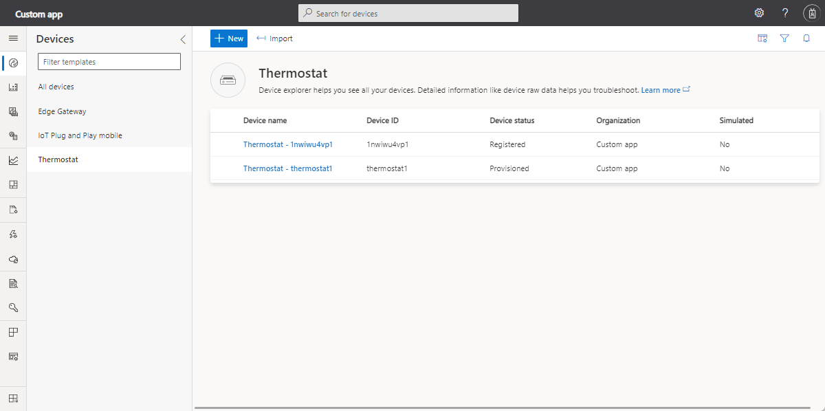 Choose Devices on the left pane. Here you see a list of your device templates and a list of all the devices accessible to your organization.