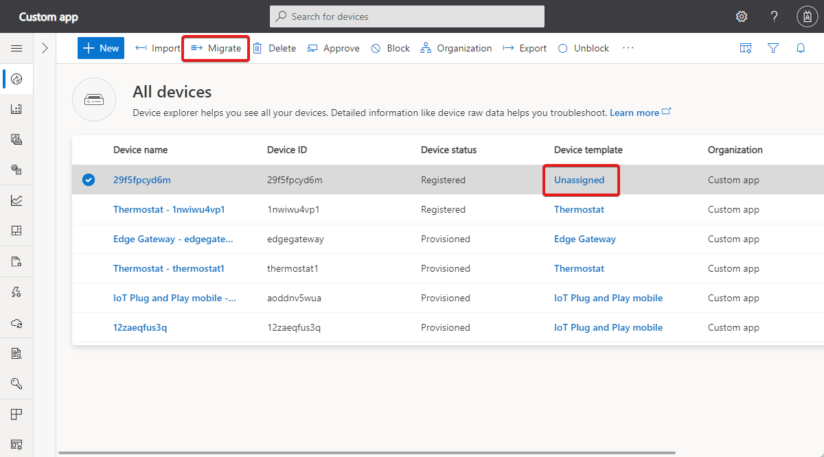 If you register devices by starting the import under All devices, then the devices are created without any device template association. Devices must be assigned to a template to explore the data and other details about the device. Follow these steps to assign devices to a template: