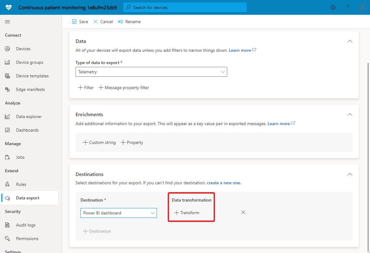 To add a transformation for a destination in your data export definition, select + Transform as shown in the following screenshot:
