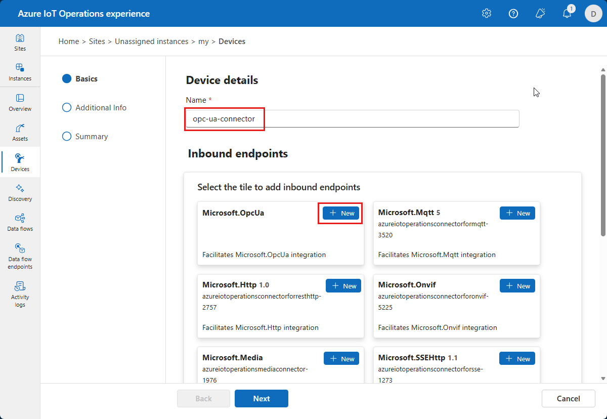 opc-ua-connectoras the device name and select New on the Microsoft.OpcUa tile:Enter the following Microsoft.OpcUa inbound endpoint information: