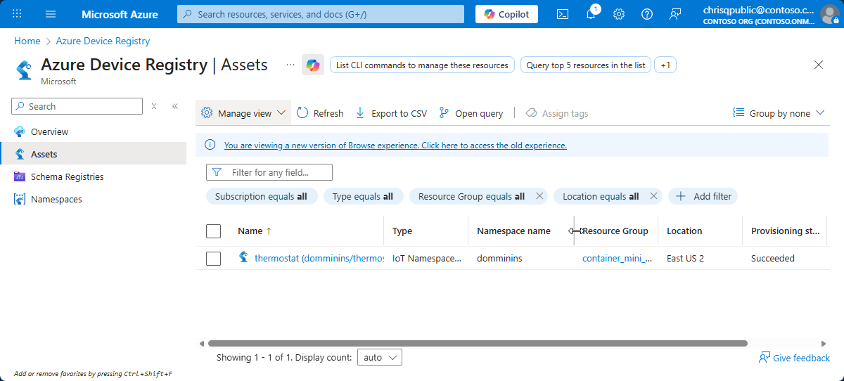 To view the device and asset you created in the Azure portal, go to Azure Device Registry: