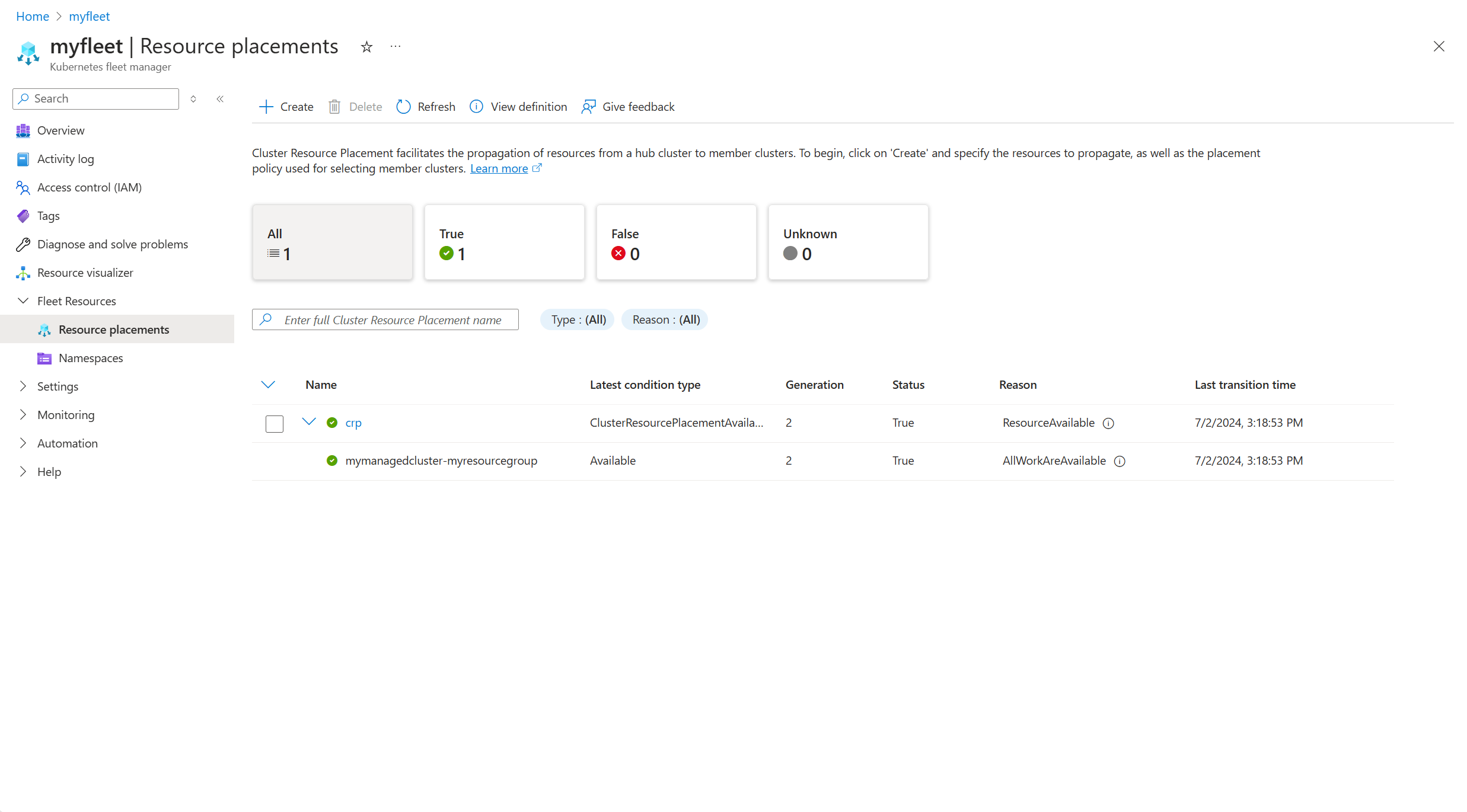 ClusterResourcePlacementobject and apply to the Fleet Manager hub cluster. In the following example, aClusterResourcePlacementnameddistribute-my-namespaceis used to deploy a namespacemy-namespaceto all member clusters by usingPickAllplacement policy: