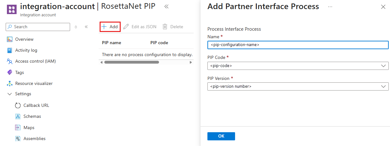 If your integration account doesn't have a PIP process configuration, follow these steps to add a configuration: