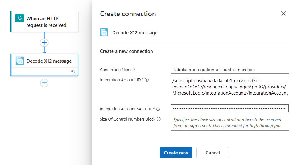 Parameter Required Description Connection Name Yes A name for the connection. Integration Account ID Yes The resource ID for your integration account, which has the following format: /subscriptions/<Azure-subscription-ID>/resourceGroups/<resource-group-name>/providers/Microsoft.Logic/integrationAccounts/<integration-account-name>