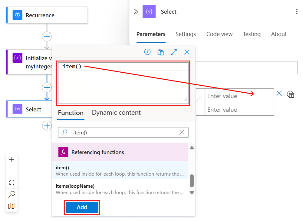 To try the Select action, follow these steps by using the workflow designer. Or, if you prefer working in the code view editor, you can copy the example Select and Initialize variable action definitions from this guide into your own logic app's underlying workflow definition: Data operation code examples - Select. For more information about this action in your underlying workflow definition, see Select action.