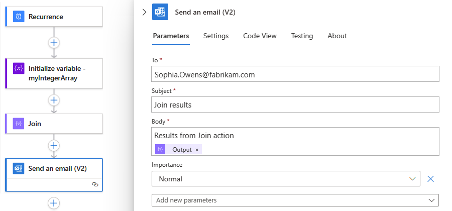 To try the Join action, follow these steps by using the workflow designer. Or, if you prefer working in the code view editor, you can copy the example Join and Initialize variable action definitions from this guide into your own logic app's underlying workflow definition: Data operation code examples - Join. For more information about the Join action in your underlying workflow definition, see the Join action.